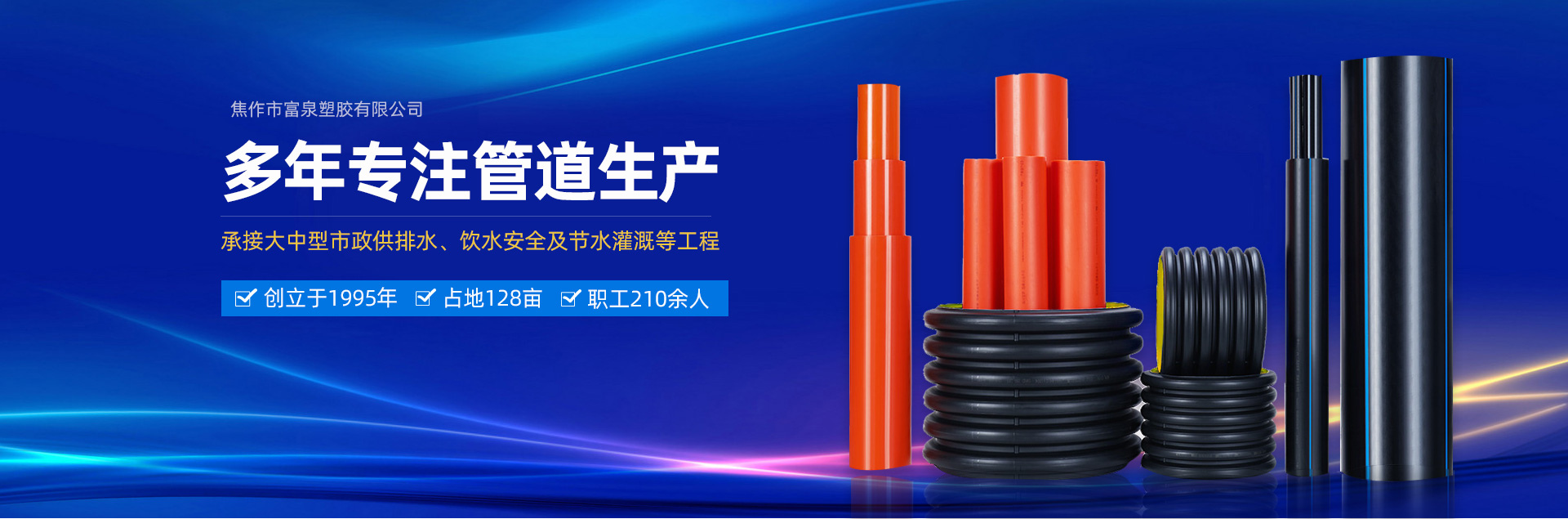 - 焦作市富泉塑膠有限公司,創立于1995年,是一家集研發、設計、生產、銷售為一體的大型管材企業。公司位于太極故里、黃河之濱一一河南焦作溫縣。公司占地128畝,現有職工210余人,其中具有中技術職稱的19人。生產、檢驗設備58臺(套),包括PVC實壁管生產線11套、PE實壁管生產線12套、HDPE雙壁波紋管生產線6套、PVC雙壁波紋管生產線5套,檢驗設備14臺(套)。主要產品有:Φ20mm-630mm、各種壓力規格的PVCU、PVC-M、PE給水管材,PVC-U節水灌溉管材,HDPE燃氣和礦用管材,DN200-800mm的HDPE、PVC雙壁波紋管及各種噴灌、滴灌工程材料。承接大中型市政供排水、飲水安全及節水灌溉等工程。 富泉塑膠公司重視產品的質量、安全、環保和節能,在同行業中率先完成了“新華節水產品認證”,全方面通過ISO9001:2008國際質量管理體系、IS014001:2004環境管理體系和OHSAS18001職業健康安全管理體系的一體化導入,并建立起規范的現代企業管理體系。公司以“質量”為先導,采用質量跟蹤、多環節把關的方法,組建具有行業水準的企業技術檢測中心,常年委托水利部節水灌溉設備檢測中心、河南省產品質量監督檢驗院對產品跟蹤檢測,并由中國人民保險公司承保產品質量。公司連續多年被河南省水利廳確定為“安全飲水設備、節水灌溉設備”定點生產企業,并獲得“中國名優產品”“質量、服務、信譽AAA企業”“河南省**產品”“河南省水利企業”“河南省守合同、重信用企業”等榮譽稱號?! 「蝗苣z公司堅持“用戶為上”的服務理念,長期以來,全方面關注客戶價值,不斷提升服務水平。服務隊伍常年為客戶的產品設計、施工、安裝提供合理的方案和全程細致、周到、**、快捷的技術服務。公司自成立以來,一直堅持以人為本的宗旨,塑造企業形象,并致力于新產品的開發,憑借雄厚的技術開發能力,先進的工藝制造流程,嚴格的質量管理保證體系,優良的售后服務網絡,已成為河南省大的飲水、灌溉及排水管材設備制造商。產品暢銷全國,而且還以公司雄厚的綜合實力在業界中占據著重要的地位。